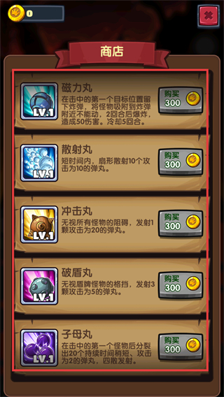 2、商店界面可購買【磁力丸】-【散射丸】等道具,合理選擇能吸附怪物或扇形散射的彈丸,助力戰斗勝利。