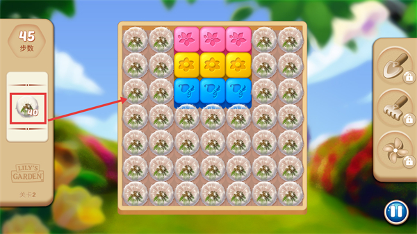 2、關(guān)卡核心目標為消除40個白色花苞,點擊右側(cè)消除。