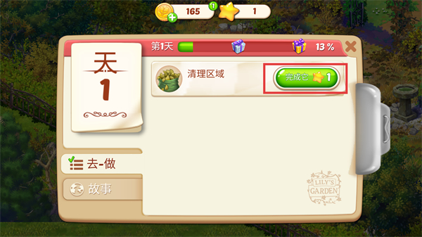 4、首日任務(wù)界面核心任務(wù)為【清理區(qū)域】,點擊紅框標注【完成它】按鈕。