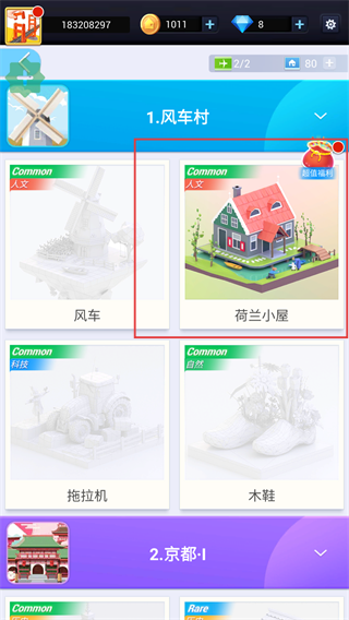 4、返回關卡選擇界面,已完成的【荷蘭小屋】會解鎖顯示,可繼續選擇其他模型(如風車)進行拼接。