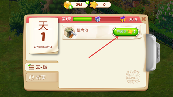 1、紅框指向【去完成】按鈕,完成【建鳥池】任務提進度。
