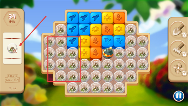 2、箭頭指向需消除3個的白色花苞,紅框標注棋盤內花苞區域。