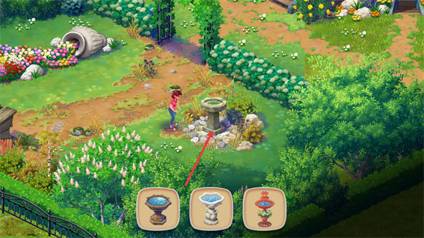 3、花園場景箭頭指向待建造鳥池的石塊區域,下方展示三類裝飾道具,完成關卡可解鎖該建造區域。