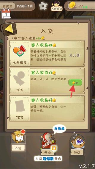 2、點擊底部“入貨”按鈕進入采購界面,選擇可解鎖的貨品(如第二個客人收益),消耗金幣點擊“解鎖”按鈕。