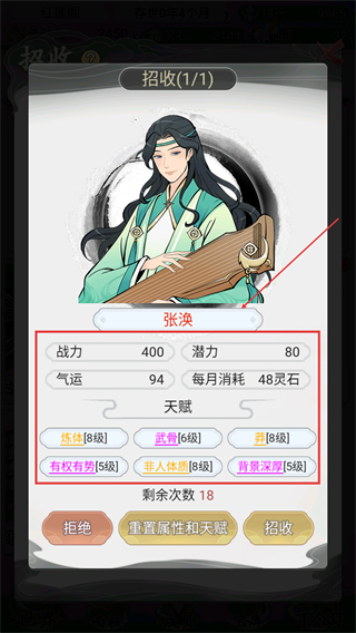 4、招收修士時(shí)查看【張渙】的【戰(zhàn)力400】【潛力80】【氣運(yùn)94】及天賦,每月消耗48靈石,剩余次數(shù)18可重置屬性和天賦。