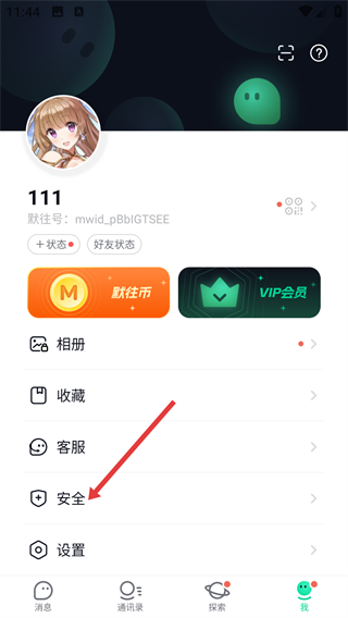 1、我們打開【默往app】,在【我】的界面點(diǎn)擊【安全】選項(xiàng)吧。