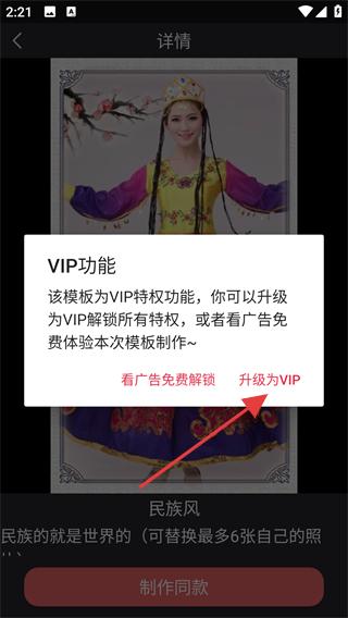 4、在彈窗中選擇【看廣告免費解鎖】或【升級為VIP】,即可使用模板制作內容。