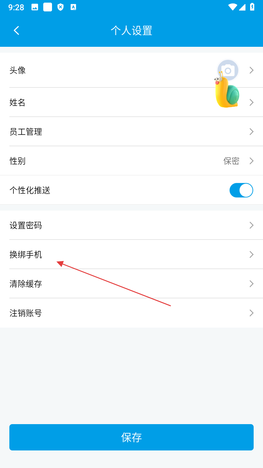 3、在個人設置頁面,點擊【換綁手機】,進入驗證手機頁面。