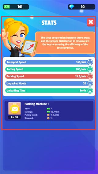 一款非常有趣的放置類模擬經營游戲,游戲中玩家將成為快遞物流大亨,玩家將快速的將各種各樣的物品進行打包發送,通過鐵路、海運、空運等多種不同的運輸方式,快速將快遞送達目的地,游戲的操作簡單容易上手,推薦給喜歡休閑放置游戲的玩家