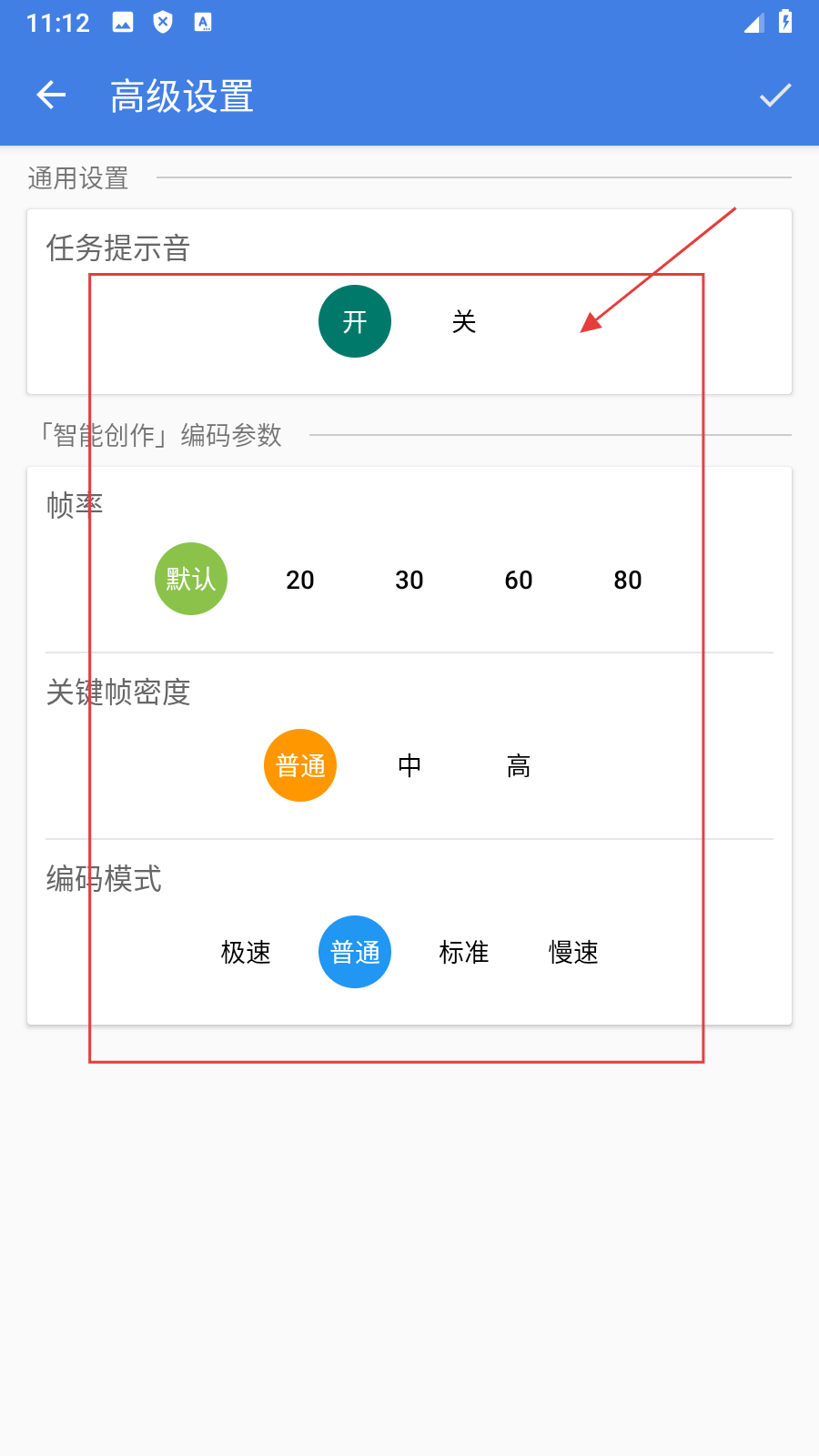 3、在高級設置頁面,調整【任務提示音、幀率、關鍵幀密度、編碼模式】等參數。