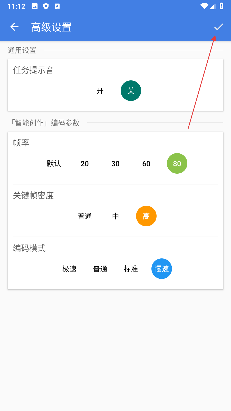 4、在高級設置頁面調整好參數后,點擊【右上角對勾】,即可保存設置。