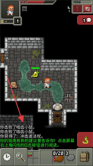 1、擊敗【嚙齒小鼠】獲得【沖擊波法杖】,提示點擊右上角【日志】按鈕閱讀新建議。