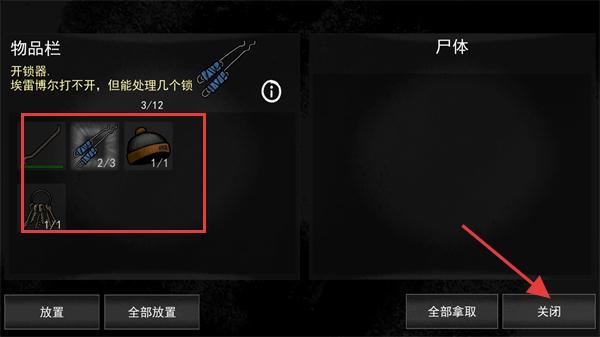 2、打開物品欄,查看已收集的道具(如開鎖器),確認道具數量后點擊“關閉”,回到場景界面。