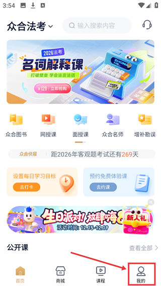 1、進入【眾合法考】首頁后,找到底部導航欄的【我的】選項并點擊,進入個人中心頁面。