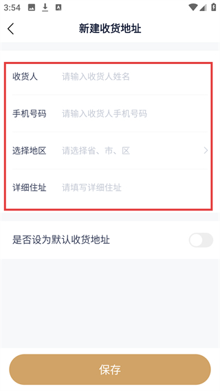 4、在【新建收貨地址】頁面,依次填寫【收貨人】-【手機號碼】-【選擇地區】-【詳細住址】,完成后可點擊保存。