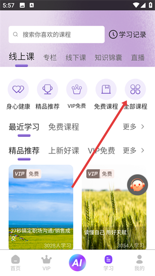 2、在學習頁,點擊【全部課程】,進入課程列表,方便找到目標課程哦。