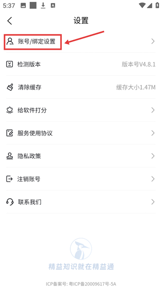 3、進入【設置】頁面后,找到并點擊【賬號/綁定設置】選項。