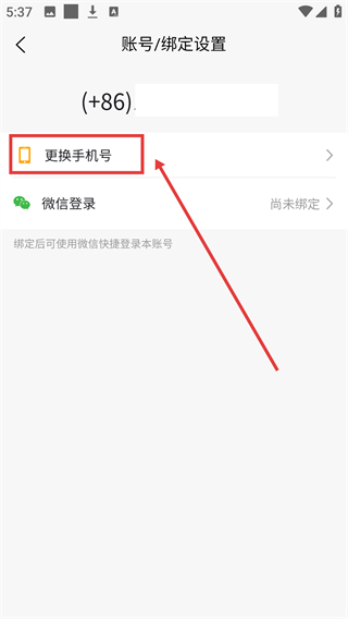 4、進入【賬號/綁定設置】頁面后,點擊【更換手機號】選項可進行手機號更換操作。