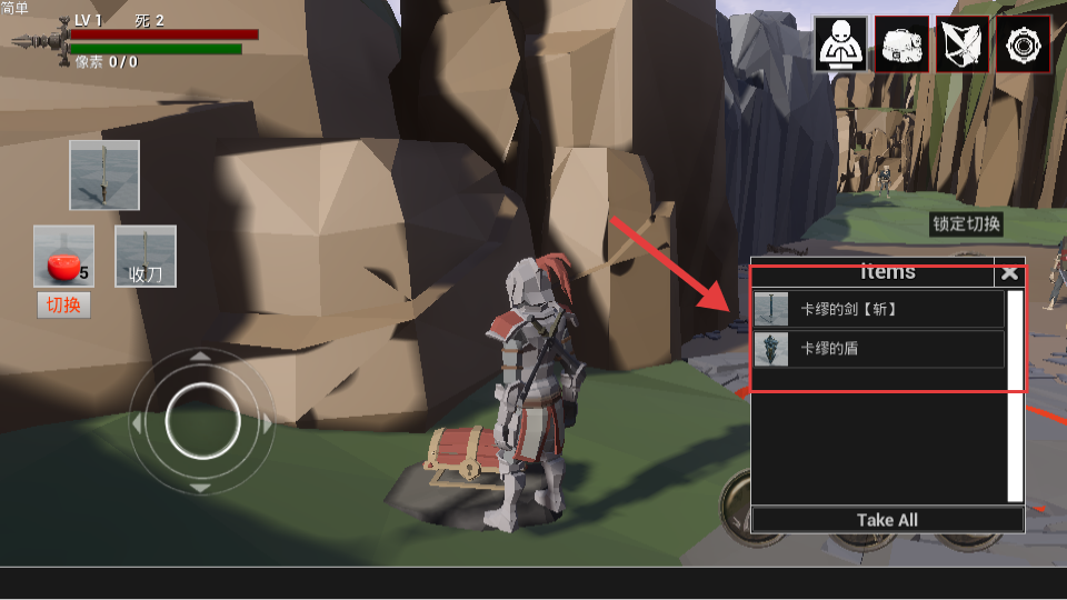 3、打開寶箱物品欄,里面有【卡繆的劍-斬】【卡繆的盾】,點擊【Take-All】快速獲取。