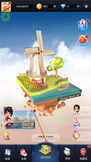 1、進入游戲后點擊【我的世界】按鈕,可查看已拼接的模型(如風車),同時積累【收藏值】推進進度。