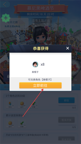 2、參與活動(如【慕尼黑啤酒節】)獲得【美櫻子】碎片后,點擊【立即前往】按鈕進入角色解鎖界面。