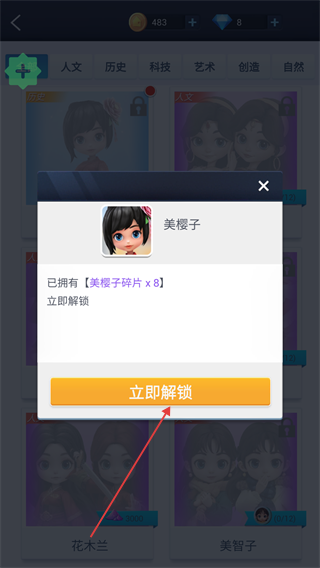 3、在角色界面中,當擁有足夠【美櫻子碎片】后,點擊【立即解鎖】按鈕,獲取該角色。