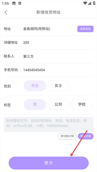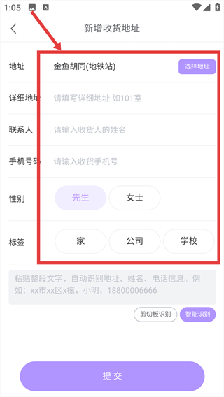 4、填完信息后,點擊底部【提交】按鈕,完成該收貨地址的保存操作。