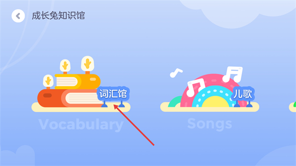 2、點擊【知識館】進入【成長兔知識館】頁面,能看到【詞匯館】【兒歌】等功能選項,可按需選擇對應學習板塊。