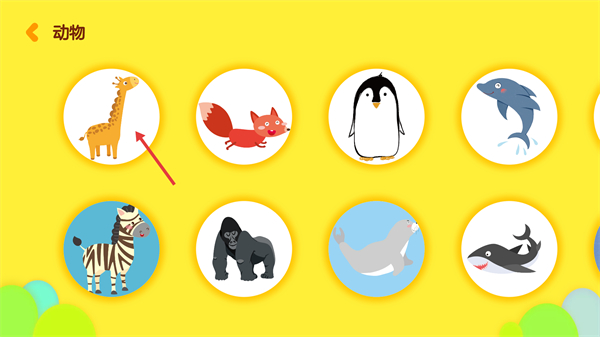 4、進入【動物】單詞學習頁面后,能看到長頸鹿、狐貍等動物圖標,點擊對應動物圖標即可開始該動物對應的單詞學習。