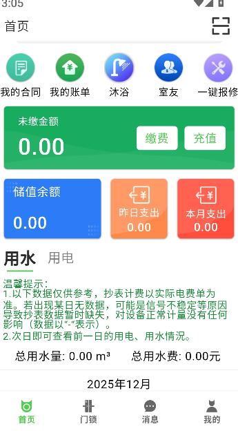 1、打開《抄表貓住戶端》軟件后,進入首頁即可瀏覽水、電的實時用量情況,方便掌握日常消耗。