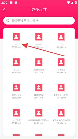 2、在尺寸頁選擇目標規格(如【一寸-25*35-mm】),進入拍攝引導界面。