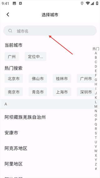 2、點(diǎn)擊【城市名】搜索欄,輸入目標(biāo)城市名稱。
