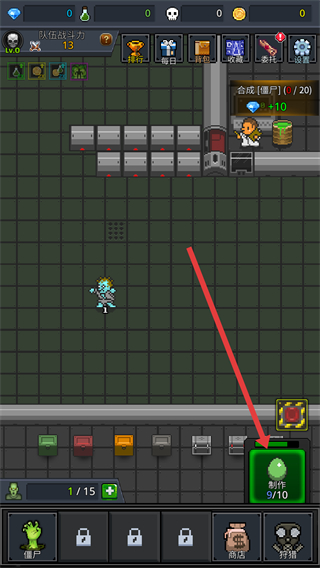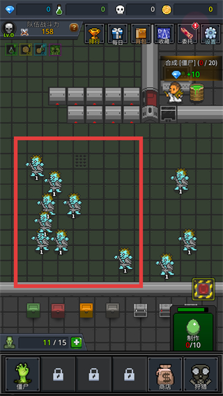 3、當上方紅框內顯示的【綠色液體】達到所需數量(如10)時,點擊【僵尸】圖標,消耗資源制造僵尸。