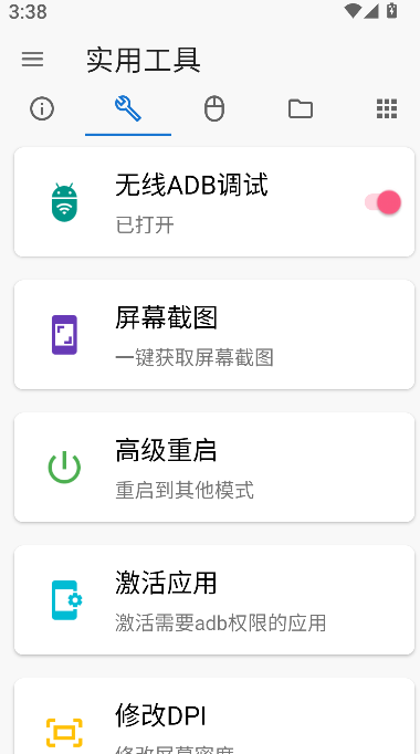 3、在工具頁面中,可使用無線ADB調試、屏幕截屏等功能,完成常用調試與操作任務。