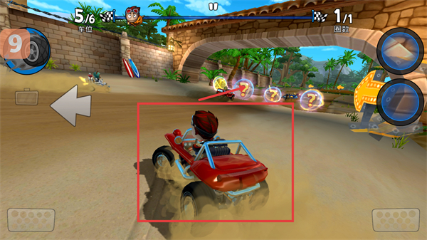 2、在賽道中拾取【?】道具獲取隨機增益,利用箭頭指示調整方向,快速超越前方對手提升車位。