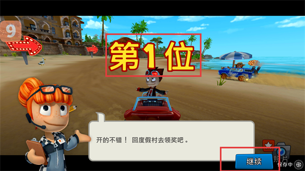 4、沖線獲得【第1位】后點擊【繼續】,返回度假村領取獎勵,為下一場比賽積累優勢。