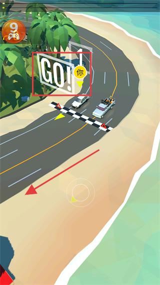 2、看到“GO!”提示后,滑動控制區(qū)域操控車輛起步,向終點(黑白格子線)方向行駛。