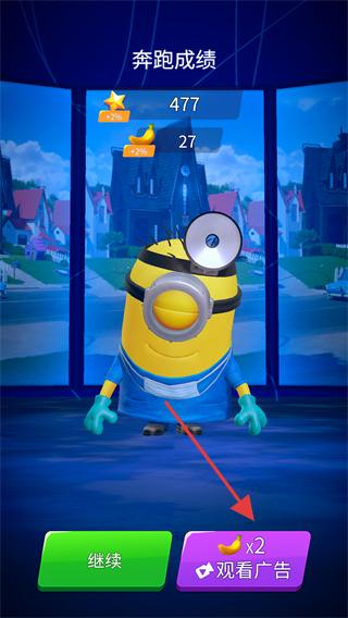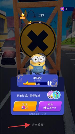 4、在【奔跑成績】界面,星星積分為【477】、香蕉積分為【27】,點擊【繼續】按鈕回到主界面。