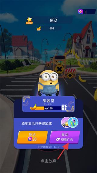 2、若跑酷失敗,可點擊【復活-觀看廣告】按鈕,重新回到賽道繼續挑戰。