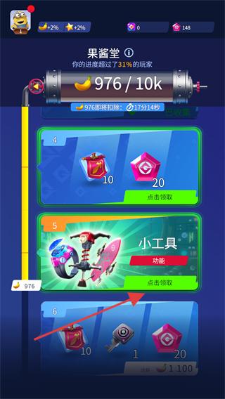 3、進入【果醬堂】界面,點擊【點擊領取】按鈕,獲取等級5對應的【小工具】獎勵。