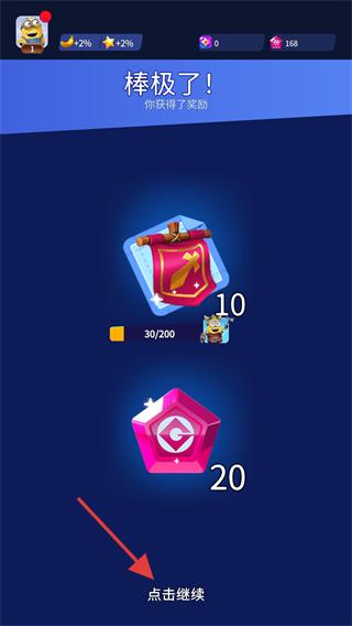 4、領取獎勵后顯示【棒極了!你獲得了獎勵】提示,點擊【點擊繼續】按鈕回到主界面。