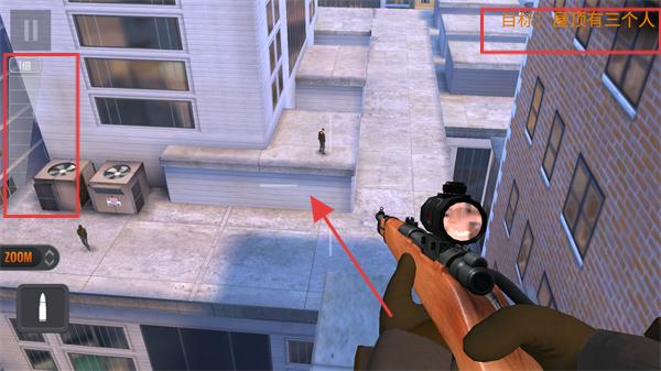 1、進入狙擊場景,右上角顯示【目標:屋頂有三個人】,操控狙擊槍瞄準屋頂的目標群體。