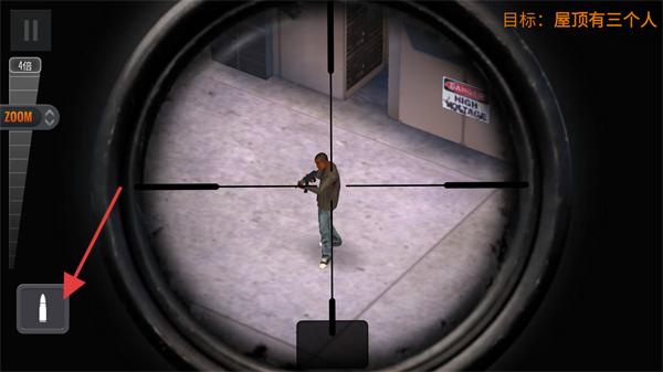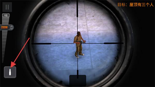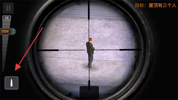 4、鎖定第三個目標,點擊【子彈】按鈕完成射擊,達成【屋頂有三個人】的消滅目標。