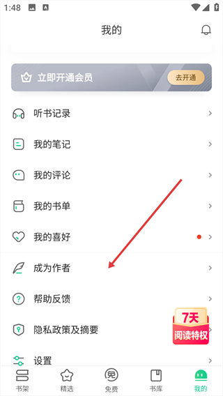 2、進入【我的】頁面后,找到【成為作者】選項。