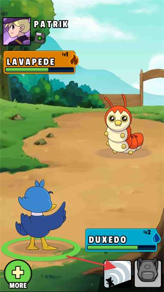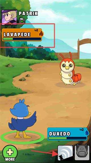 1、對戰界面確認對手【PATRIK】的【LAVAPEDE-lv1】,操控己方【DUXEDO-lv2】點擊技能按鈕發起攻擊。