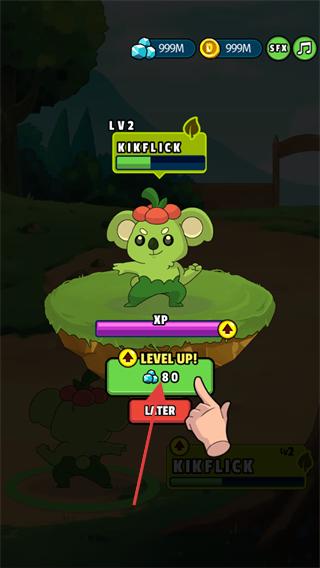 4、對戰后【KIKFLICK】觸發【LEVEL-UP】,點擊【LATER】按鈕暫存獎勵,繼續游戲流程。