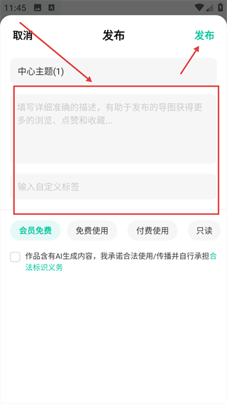 4、進入發布詳細設置頁面,填寫描述、標簽等內容后,點擊【發布】按鈕,完成作品發布操作。