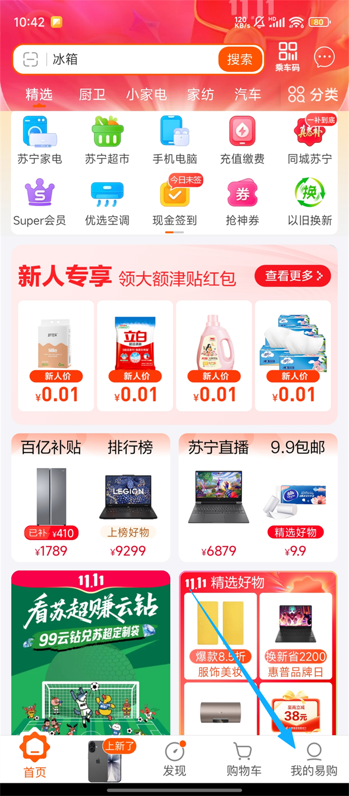 1、打開蘇寧易購App,進入首頁后,點擊底部【我的易購】,便能進入個人相關(guān)頁面,為后續(xù)找客服鋪好路哦。