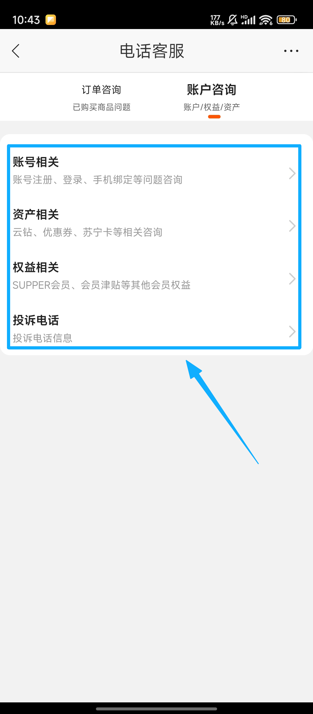 4、在【電話客服】頁面,選擇【賬戶咨詢】板塊,里面有賬號、資產(chǎn)等相關(guān)分類,根據(jù)需求點選就能找到對應的人工服務啦。