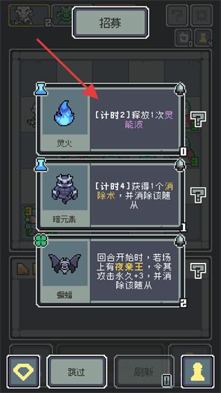 3、戰斗間隙可通過【招募】界面獲取新棋子,比如選“靈火”(計時2回合釋放1次技能)增強陣容。